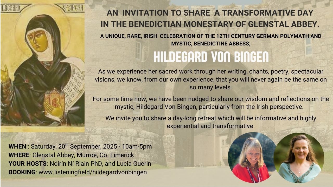 For some time now, we have been nudged to share our wisdom and novel reflections on the German medieval mystic, Hildegard Von Bingen, particularly from the Irish perspective.  Over several conversations, we decided to present a once-off day-long workshop which will be informative and highly experiential and transformative.